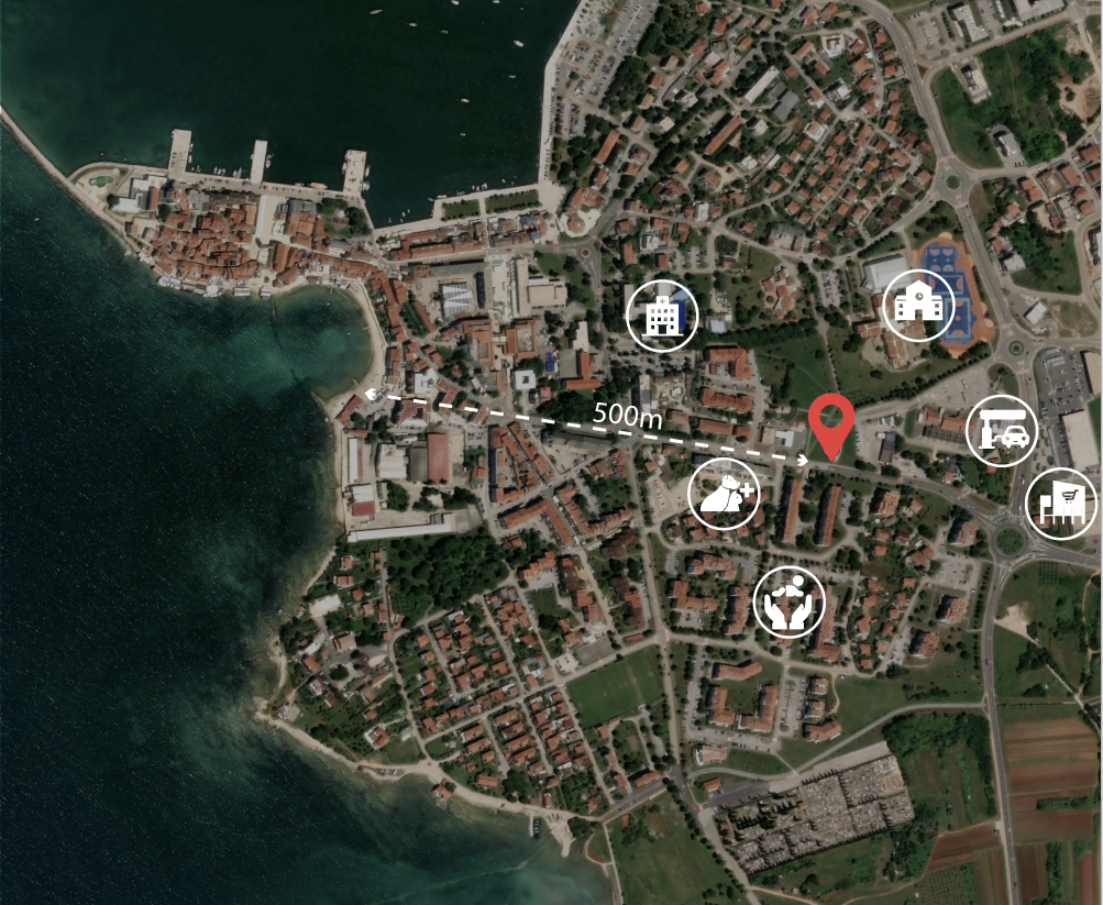 Projekt Umag Dom se nahaja na idealni lokaciji, le 500 metrov od plaže, od koder je mogoče z lahkoto priti do obale in morja. Obdan z vsem, kar potrebujete za vsakdanje življenje – vključno s šolo, zdravstvenim centrom, veterinarsko kliniko, vrtcem in supermarketom – ta lokacija združuje udobje, priročnost in resnično praktičen življenjski slog. To je redka lokacija, kjer je vse, kar potrebujete, v bližini, medtem ko je čar Jadrana oddaljen le nekaj minut.